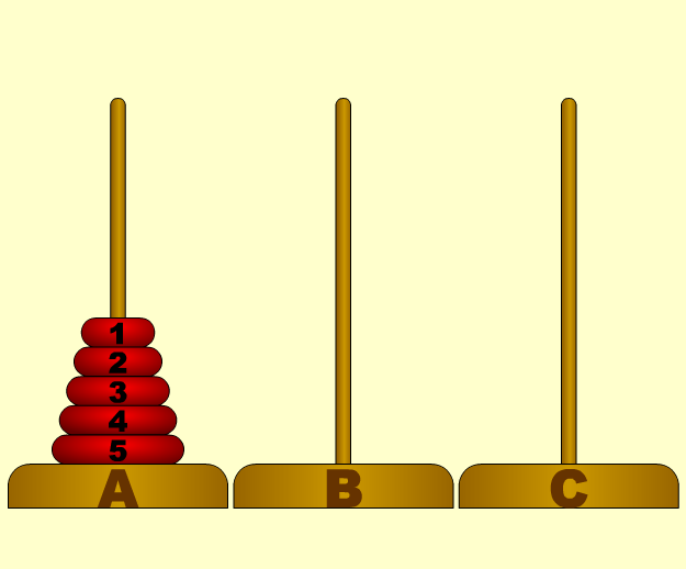 - Each move consists of taking the upper disk from one of the stacks and placing it on top of another stack or on an empty rod.