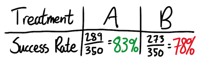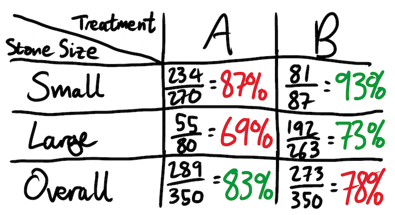 “This means that Treatment A gets to rack up a large number of easy wins on small kidney stones, whereas Treatment B performs admirably but relatively worse on the larger, more difficult ones. When you come to calculate overall rates, Treatment A’s success rate is dominated by all the easy stones it got to work on. Treatment B’s success rate is higher on both small and large stones, but since it is mostly used on larger, more difficult stones, its overall rate looks superficially worse.