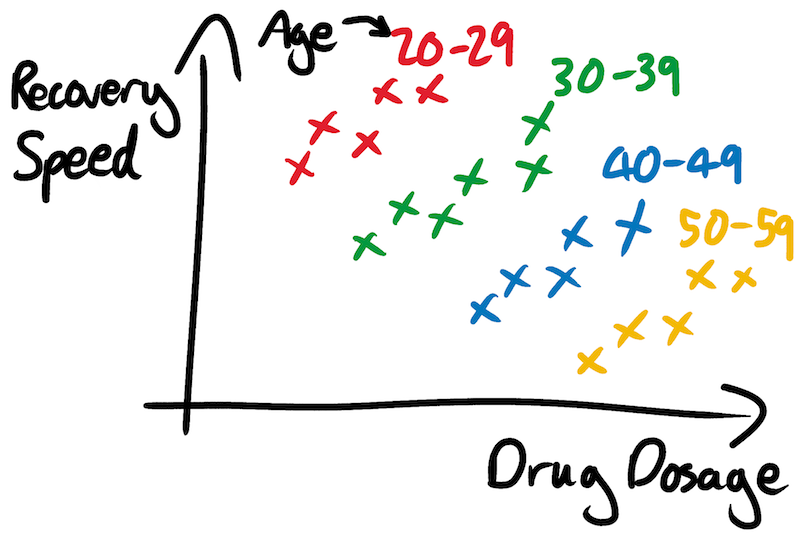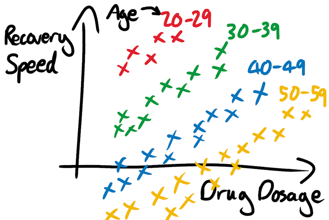 “If you’re 20 years old, you want more drugs. If you’re 30 years old, you want more drugs. If you’re 40 years old, you want more drugs. But if you don’t know how old you are, it seems like you want fewer drugs. It’s Simpson’s Paradox again, but wearing a slightly different hat.