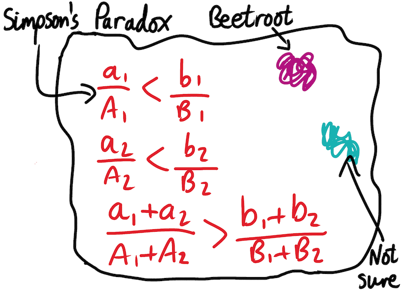 “This is just Simpson’s Paradox,” Steveington says, brusquely. “The maths behind it is insanely boring. It’s just a mathematical fact that all of the following inequalities can be true simultaneously.” He scrawls some barely legible equations on a food-stained napkin: